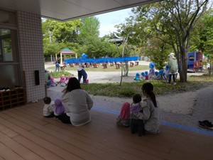 | 5月17日の運動会の練習が始まりました。運動会に参加しない小さな子どもたちも毎日練習に参加している気分で太鼓や音楽合わせて身体を動かしています。 |