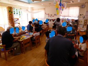 | お部屋に戻り、七夕飾りを一緒に作りました。 短冊にも願い事を書きました。 |