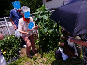 | 畑で育てたキュウリ、ナスをお土産として 収穫して頂きました。 |