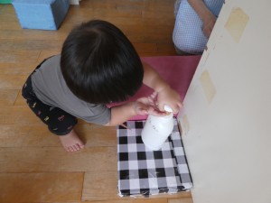| シールを貼ったり、模様を描いたり、 みんなでてるてる坊主の製作をしました。 |
