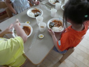 | 給食は紙皿紙コップ、使い捨てスプーンでいただきます。いつもと違うため、少し使いづらい所がありましたが、みんな工夫をしながらよく食べる事ができました。 |