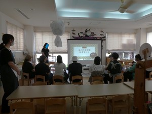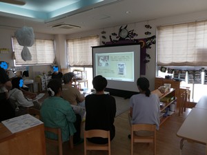 | 保育園の給食の様子などスライドでみました。 最後に保育園で使っている食器を紹介すると、 みなさん興味を示され盛り上がりました。 |
